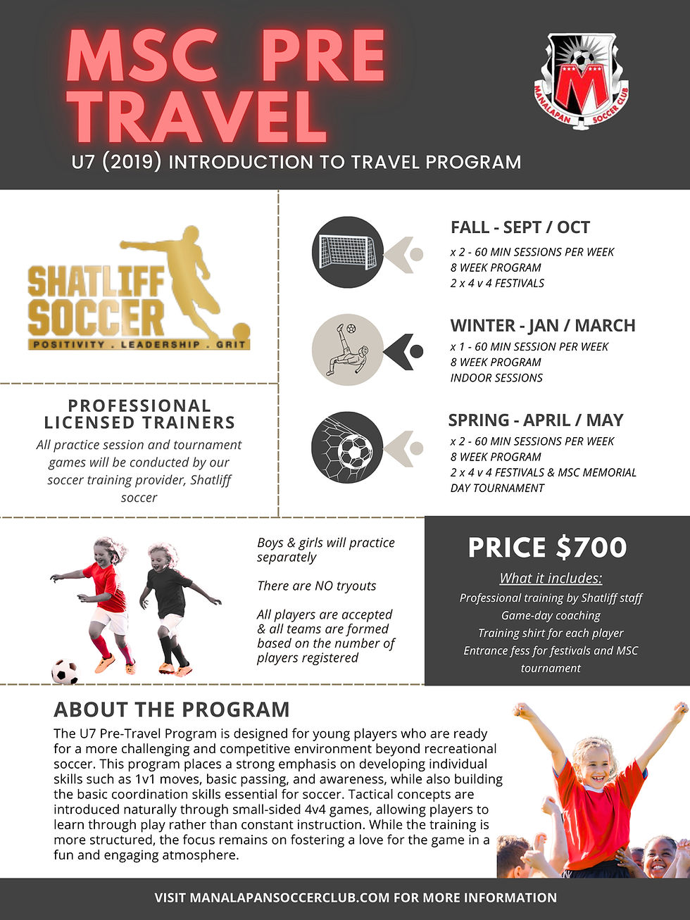 Our Pre-Travel program is designed to prepare young players for the competitive world of travel soccer. While more competitive than recreational soccer, the program remains fun and focused on developing technical skills and basic tactical understanding. The structure mirrors that of a typical travel season, featuring festival-style games and training throughout the Fall, Winter, and Spring, with the season concluding at the Manalapan Memorial Day Tournament. It’s the perfect opportunity for 2019 players to take their skills to the next level in a supportive, development-focused environment.